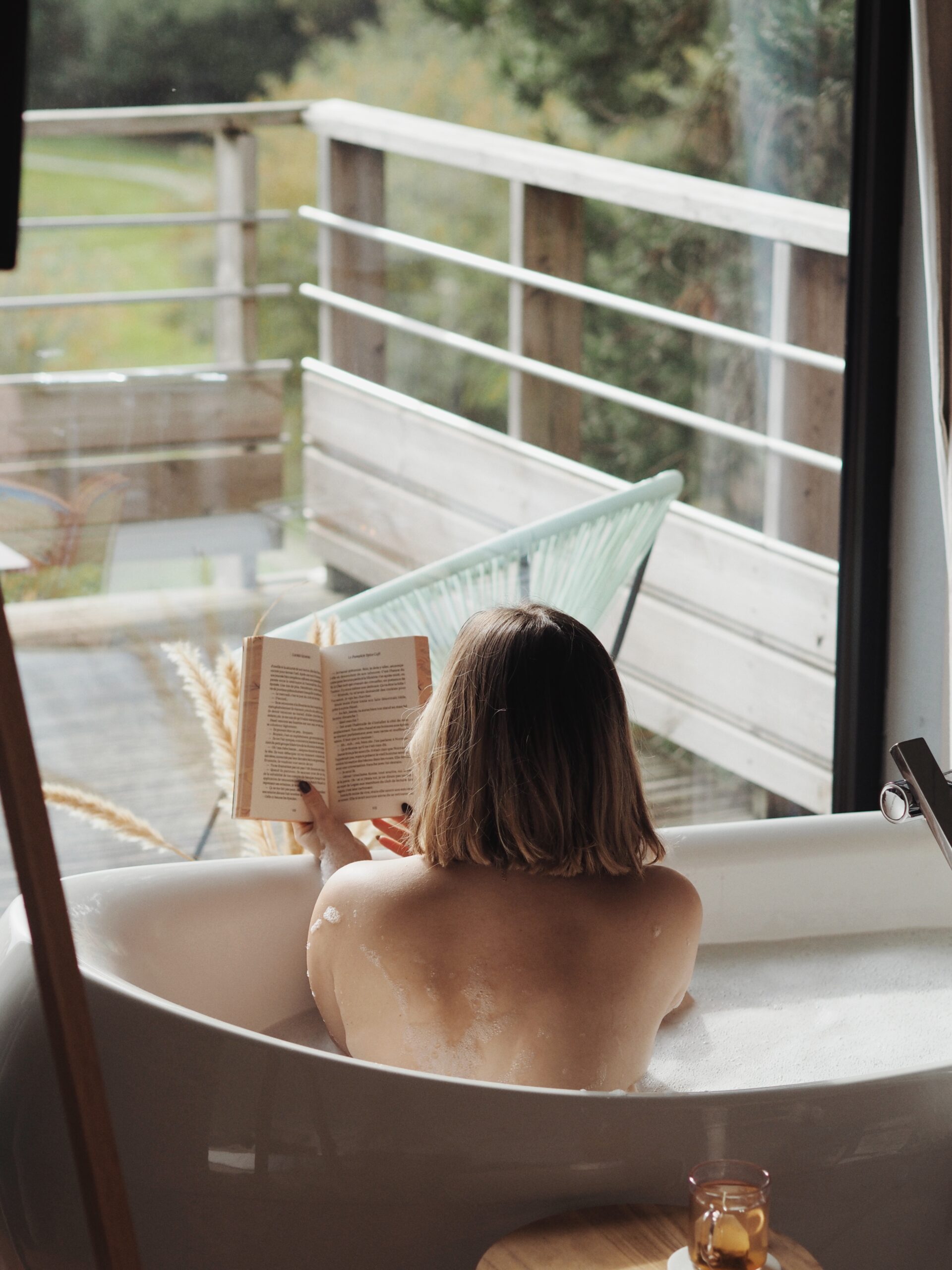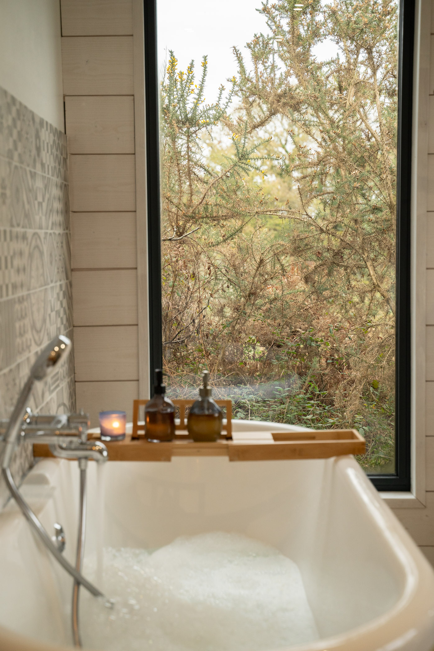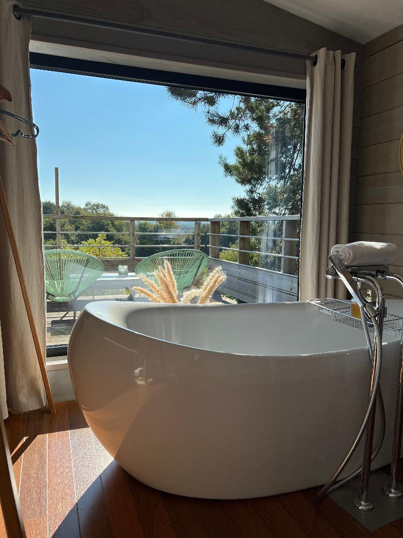 A l’intérieur, derrière une large baie vitrée, la baignoire îlot offre un spectacle sur la nature et en surplomb depuis son bain.