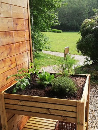Création d’un carré potager bio près de la cuisine d’été, herbes aromatiques et tomates cerise pour agrémenter vos grillades ou salades d’été.